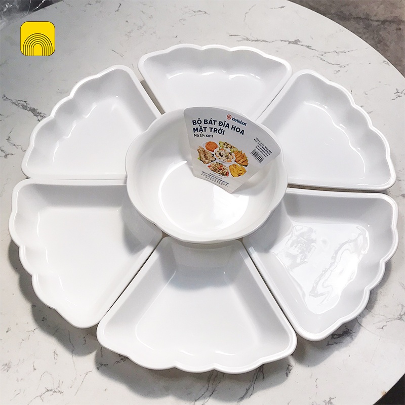 Set đĩa hoa mặt trời gốm sứ Bát Tràng cao cấp men trắng sang chảnh 1 set gồm : 1 bát tô , 6 đĩa cánh hoa , 6 bát cơm, 1 bát mắm ,