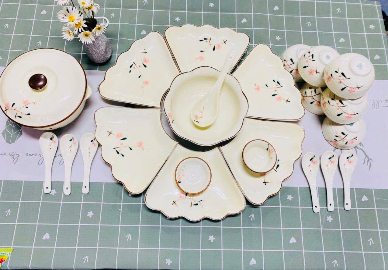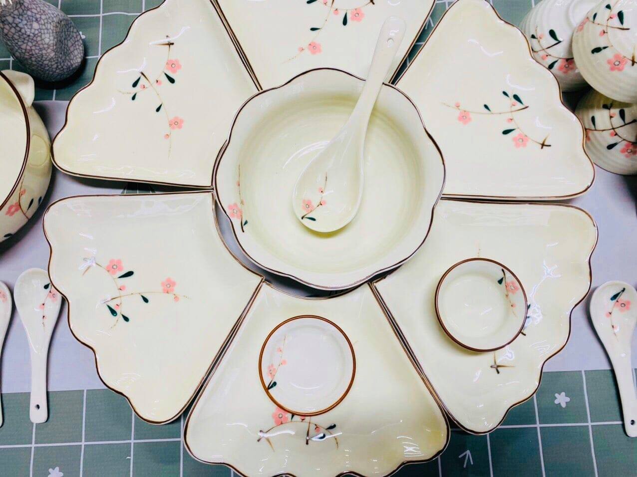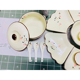 Bộ đồ ăn Vẽ tay đào Hồng men kem Hoa mặt trời: 6 đĩa 6 bát cơm 1 tô canh Sz 20cm 1 bát mắm 1đĩa muối