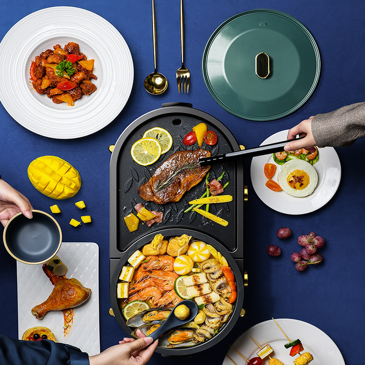 Nồi lẩu nướng điện đa năng 2 trong 1, nướng siêu chống dính cùng với lẩu 2 ngăn tiện lợi