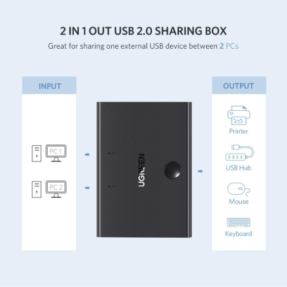 Bộ chia máy in 1 ra 2 cổng USB 2.0 U.green 30345 cung cấp khả năng chuyển đổi dễ dàng của 1 thiết bị USB giữa 2 máy tính chỉ với một chạm, giúp bạn tránh khỏi những rắc rối khi phải cắm và rút phích cắm nhiều lần. Lưu ý quan trọng: Để truyền dữ liệu tốt hơn, vui lòng giữ Cáp USB (được kết nối với các thiết bị đầu vào và đầu ra) có chiều dài dưới 3M.