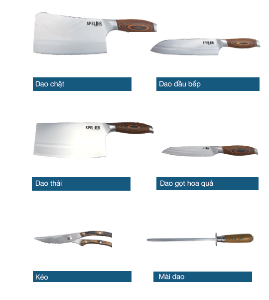 Thông tin sản phẩm Dụng cụ nấu ăn theo bộ Thương hiệu: Spelier Bộ dao làm bếp gồm 07 món: 01 dao chặt xương, 01 dao thái, 01 dao đầu bếp, 01 dao gọt hoa