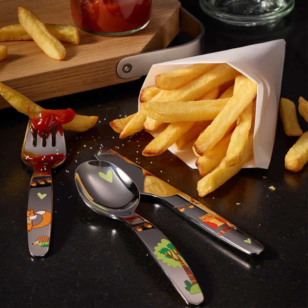 Bộ Dao Thìa Dĩa Trẻ Em Rosle Waldfreunde 95066 4 Món lấy cảm hứng từ những động vật, mỗi bữa ăn sẽ trở thành một dịp vui của các bạn nhỏ. Mỗi mảnh được trang trí