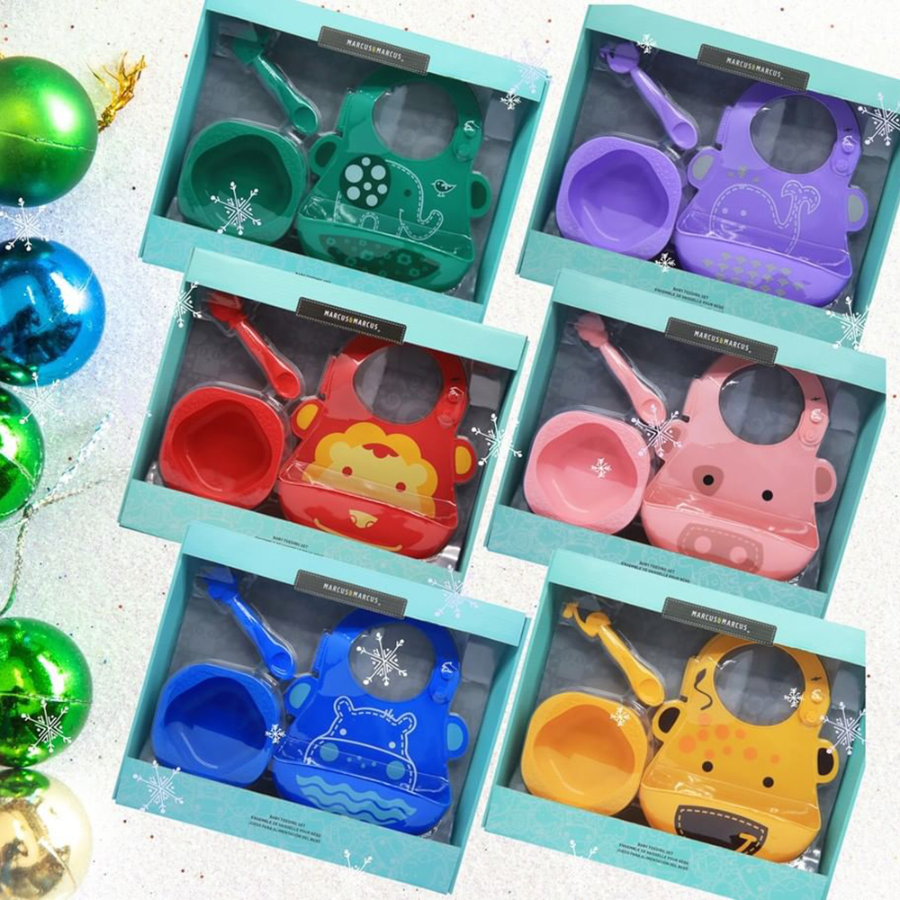 Hãy chọn cho bé một bộ đồ dùng ăn dặm Baby được thiết kế theo chủ đề những con vật đáng yêu trong đại gia đình Marcus & Marcus: sư tử Marcus, heo con Pokey, hươu cao cổ Lola, voi con Ollie, cá voi Willo và hà mã Lucas.