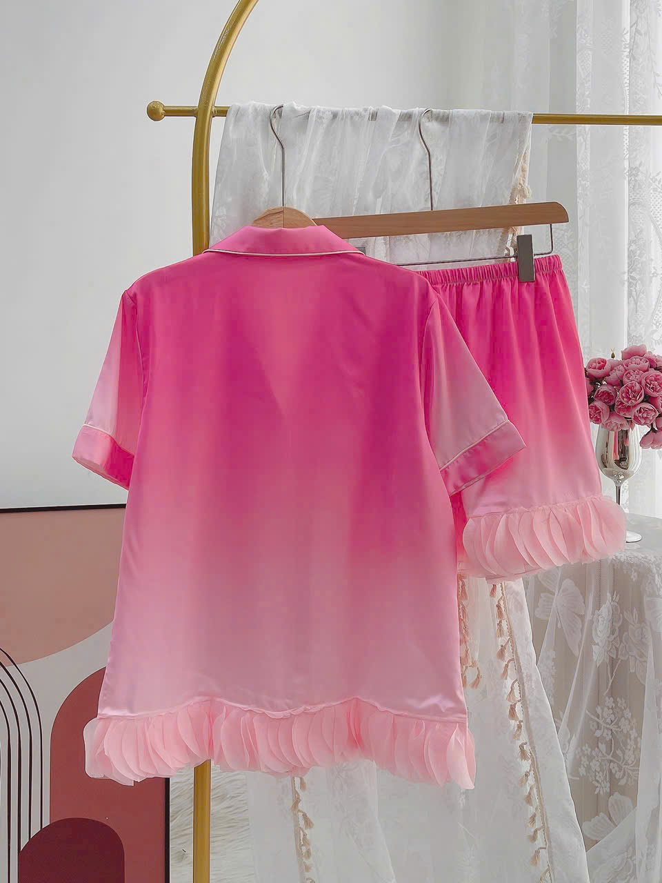 Đặc điểm nổi bật: - Bộ short satin màu hồng - tay ngắn + cổ dalton + đắp túi ngực + phối dây ruband - đô thân sau - Chất liệu satin - Dáng bộ