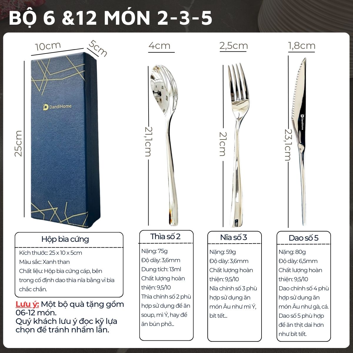 6 thìa cà phê, thích hợp cho việc thưởng thức cà phê, trà, soup hoặc các loại bánh ngọt. 6 nĩa nhỏ, hoàn hảo cho việc ăn trái cây, bánh ngọt hay các món ăn