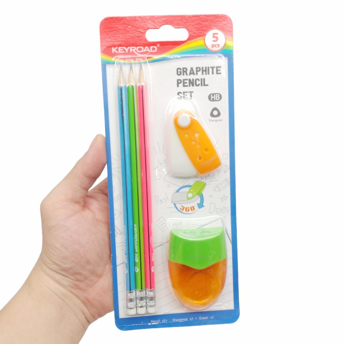 Bộ dụng cự gồm : 3 bút chì HB tam giác + 1 gọt bút chì + 1 gôm tẩy.