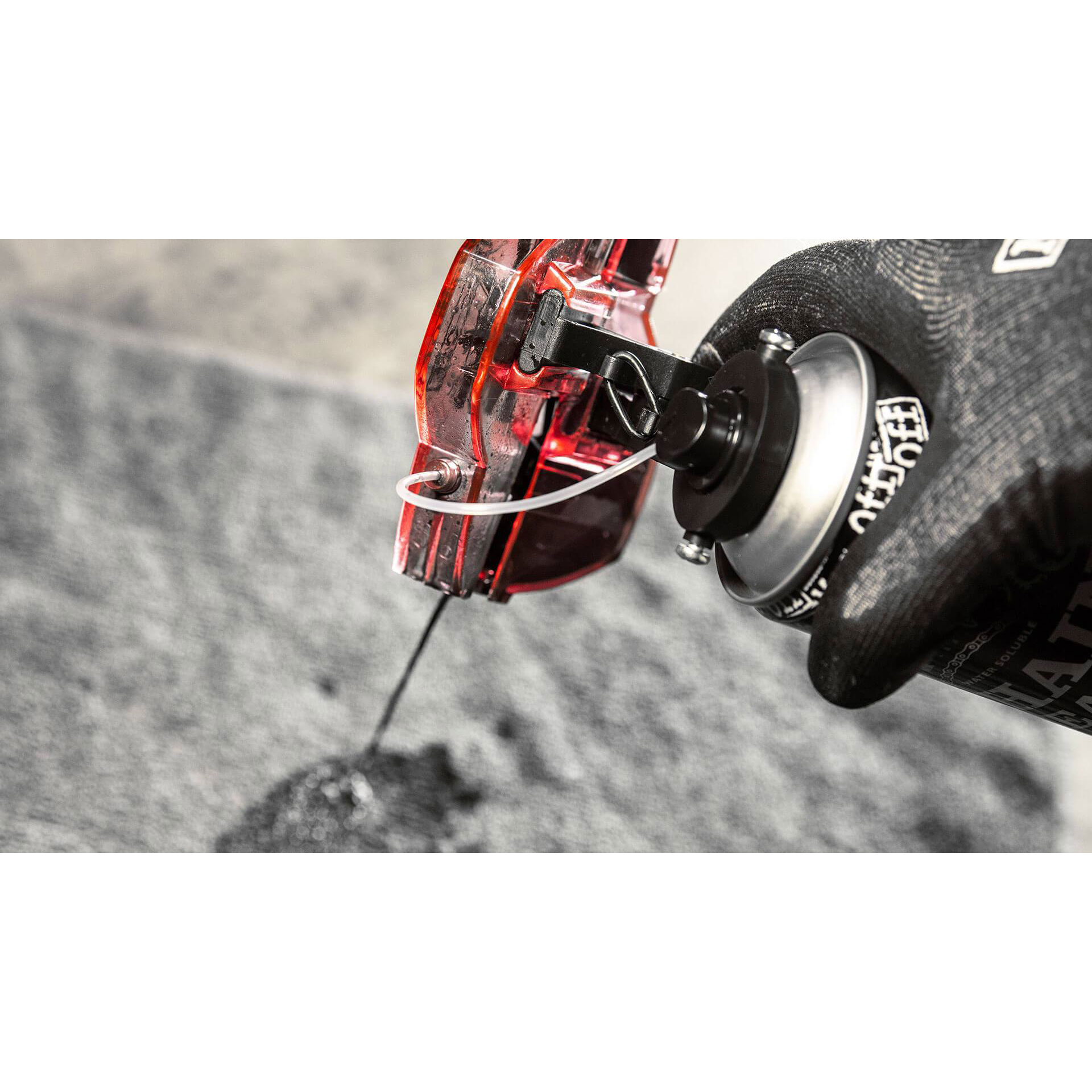 - Bước 2 - Giữ dụng cụ làm sạch sên xích bên tay trái với ngón tay cái trên nút phun và ngón trỏ qua phần cò gạt dụng cụ Chain Doc. Định vị cụng cụ Chain Doc trên phần sên xích.