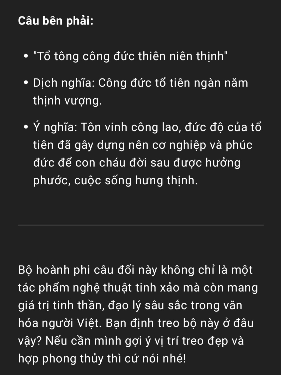 Mua tại TiktokBộ hoành phi câu đối được làm bằng chất liệu gỗ hương tự nhiên 100% Kt cặp câu đối 25x127x4cm Kt bức đại tự 25x17x4cm Bộ hoành phi câu được chạm khắc khắc chữ nổi vô cùng tỉ mỉ tinh xảo kỳ công.Đi hầu hết tất cả mọi chi tiết góc ngách nội dung hoa văn đều được gọt tỉa chỉnh sửa sắc nét hoàn toàn bằng tay thủ công truyền thống.