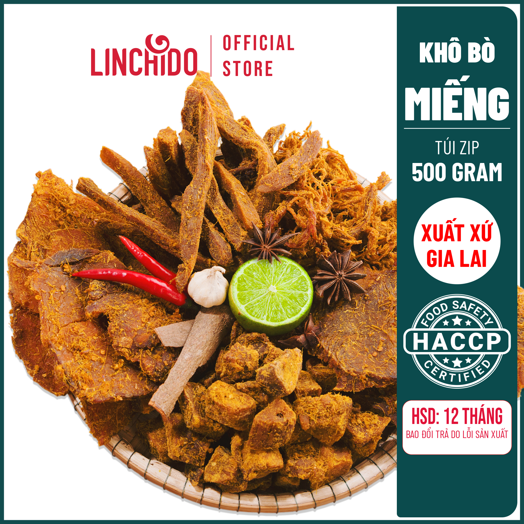 KHÔ BÒ MIẾNG MỀM DAI Xuất xứ: Việt Nam. Hạn sử dụng: In trên bao bì Quy cách: HỘP 500G Thành phần: + Thịt bò đùi sạch 100%. + Ớt, tỏi, sả, ngũ vị hương