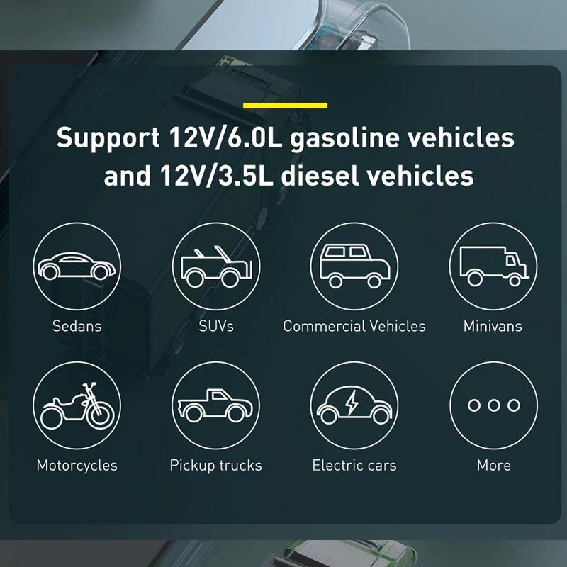 - Được thiết kế chuyên dụng, Bộ Kích bình Baseus Super Energy Pro Car Jump Starter phù hợp cho các loại xe ô tô sử dụng xăng và dầu hiện nay với dòng điện kích