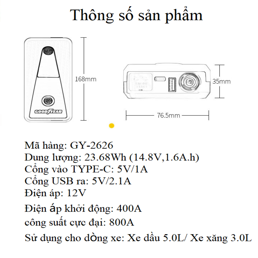Giới thiệu kích bình kiêm pin sạc dự phòng Goodyear GY-2626
