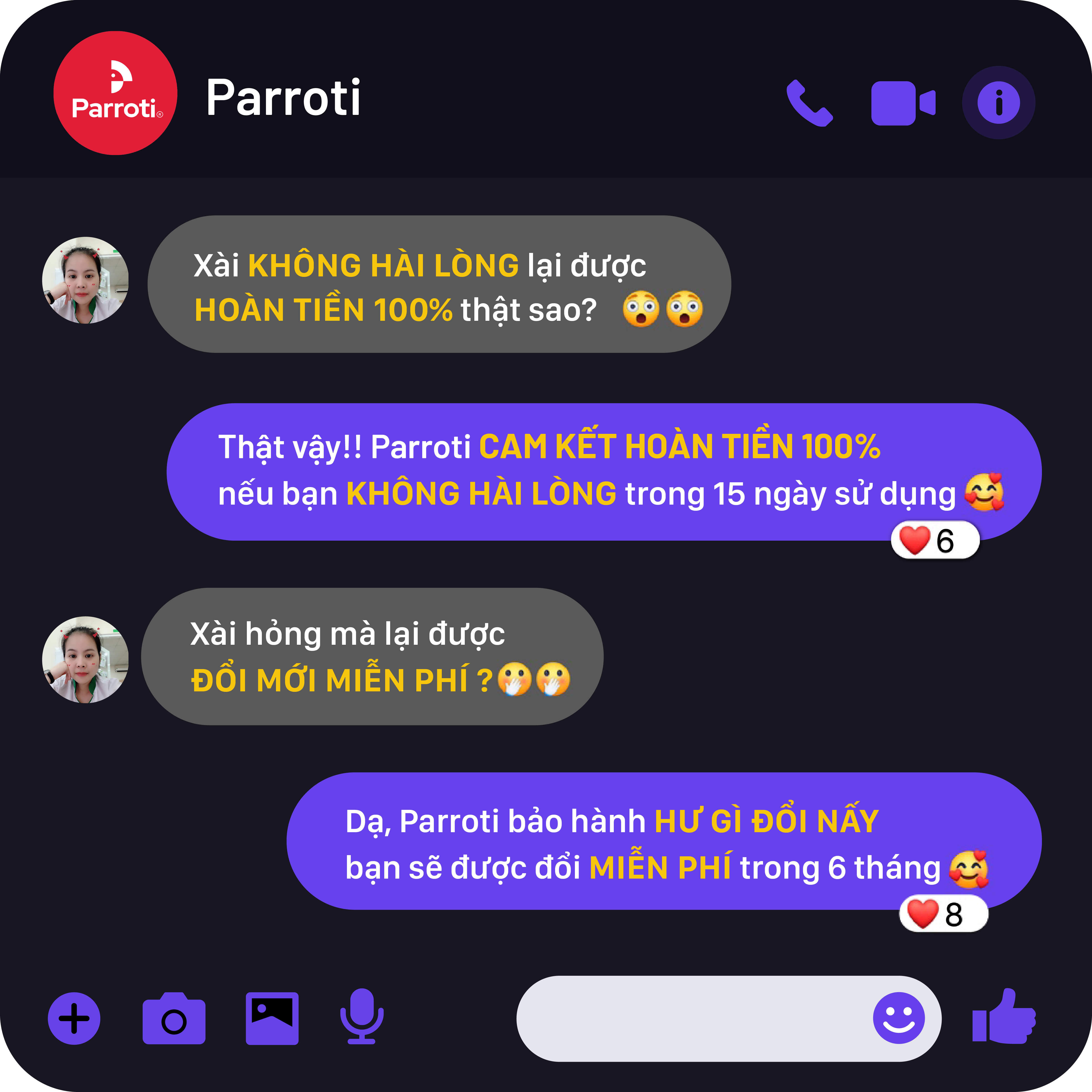 - Chất lượng đảm bảo 100% và đúng như hình ảnh, Parroti sẽ hoàn tiền nếu sản phẩm không giống mô tả.