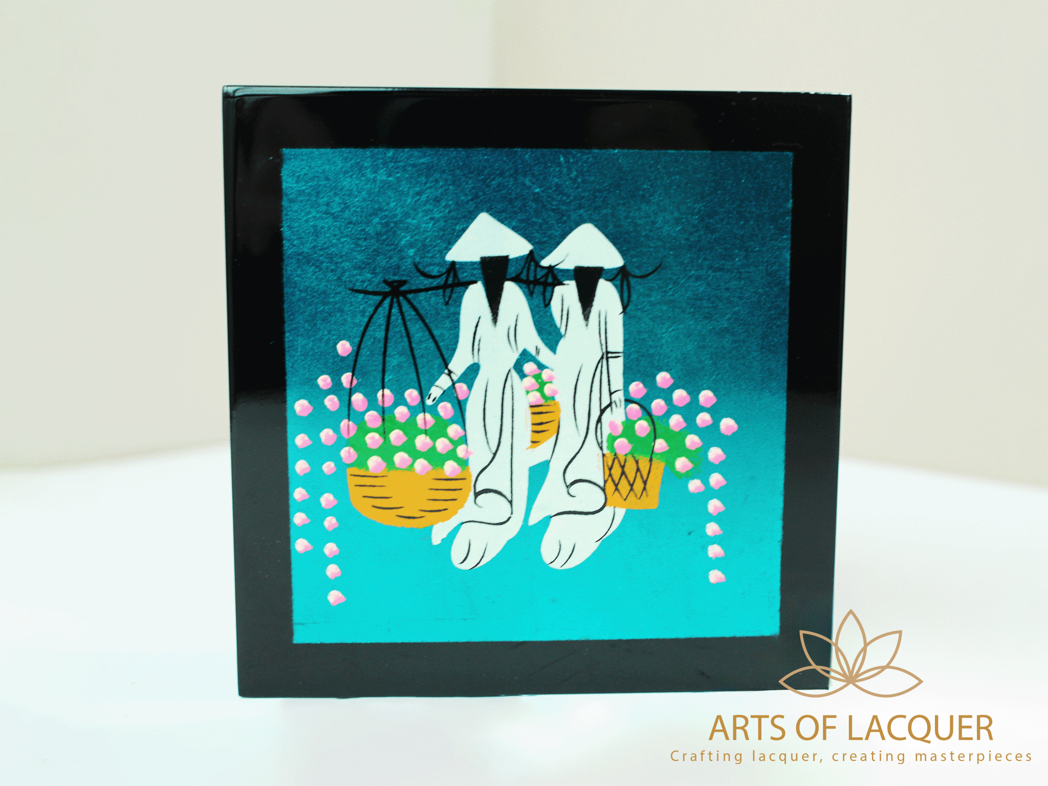 Đây là một bộ sáu chiếc đế lót ly được thiết kế vô cùng tinh xảo và độc đáo. Mỗi chiếc lót ly có hình vuông, được đặt trong một khung màu đen mạnh mẽ tạo nên sự tương phản rõ rệt với hình ảnh trung tâm. Nền của hình ảnh trên lót ly là màu xanh dương nhẹ nhàng, tạo cảm giác thanh bình và dễ chịu. Hình ảnh nổi bật trên nền xanh là hai người phụ nữ mặc trang phục áo dài truyền thống Việt Nam và đội trên đầu chiếc nón lá. Trên vai họ là những gánh hoa chứa những bông hoa màu sắc tươi sáng mang đậm bản sắc văn hóa Việt.