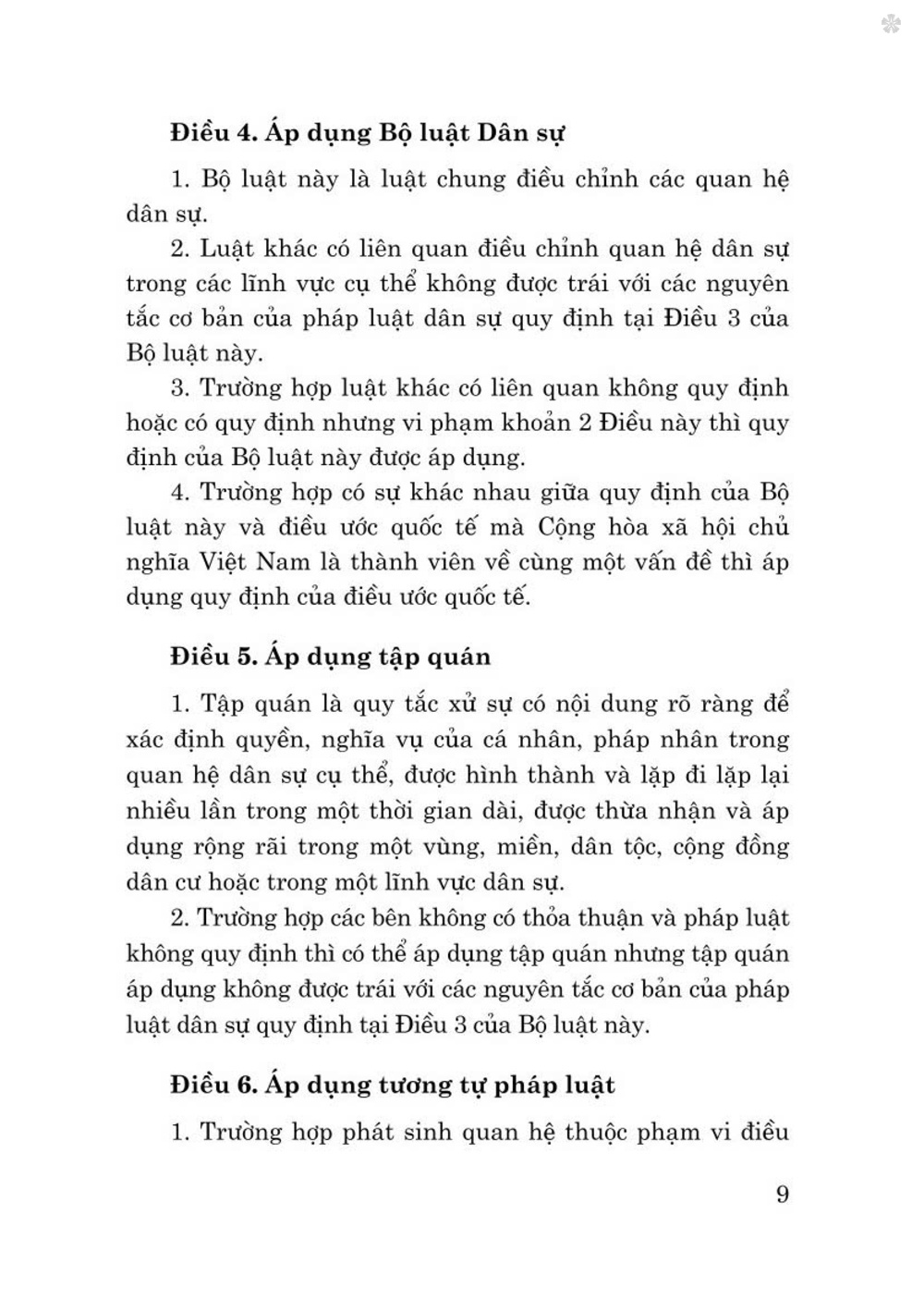 Mua tại TiktokBộ luật Dân sự năm 2015 quy định địa vị pháp lý, chuẩn mực pháp lý về cách ứng xử của cá nhân, pháp nhân; quyền, nghĩa vụ về nhân thân và tài sản của cá nhân, pháp nhân trong các quan hệ được hình thành trên cơ sở bình đẳng, tự do ý chí, độc lập về tài sản và tự chịu trách nhiệm. Bộ luật thể hiện sự thay đổi mạnh mẽ trong tư duy của các nhà làm luật với nhiều quy định mới mang tính đột phá từ kết cấu, kỹ thuật lập pháp với nhiều nội dung mới so với Bộ luật Dân sự năm 2005 theo từng chế định như: tài sản, thừa kế, bồi thường thiệt hại...