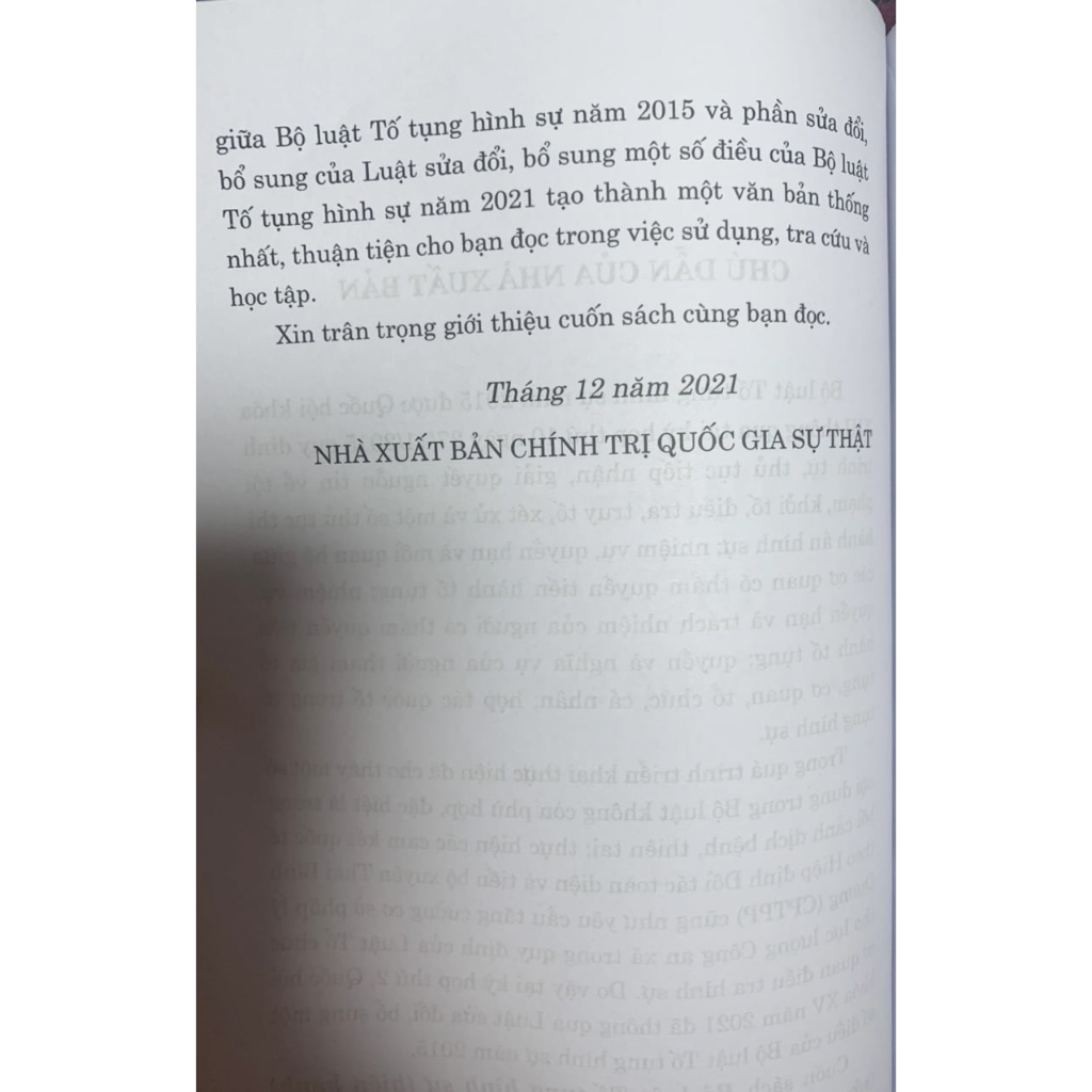 Phiên bản Bộ luật tố tụng hình sự năm 2015 (đính kèm 4 trang nội dung chỉnh sửa năm 2021), nên bạn đọc cân nhắc khi mua tham khảo Bộ luật tố tụng