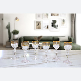 Bộ ly pha lê 1186 với miệng ly mạ đường chỉ vàng, bên dưới là dây hoa mạ platin, tiếp theo là đường chỉ vàng vòng quanh thân ly