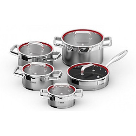 Bộ nồi inox 5 đáy nhập khẩu từ Đức, sáng bóng không gỉ, tay cầm cách nhiệt, nắp kính cường lực