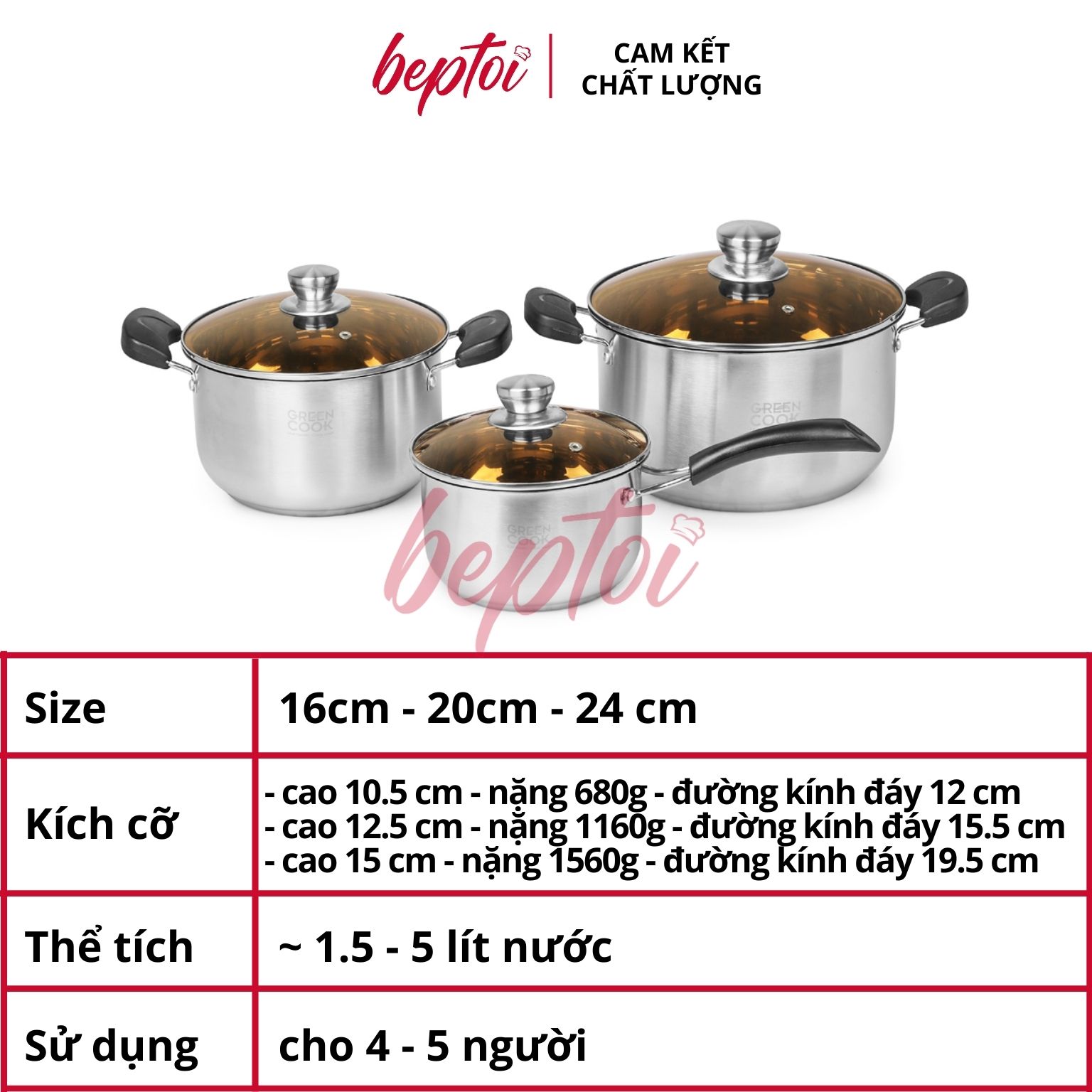 Bộ 3 nồi inox có đường kính lần lượt quánh 16 cm, nồi 20 cm và nồi 24 cm dùng kho mặn, nấu canh, lẩu, cháo, soup,… sử dụng thuận tiện cho gia đình 2 – 5 thành viên Quánh Inox nhỏ 16 cm thích hợp để nấu cháo, súp cho bé ăn dặm, luộc được 4 - 5 quả trứng vịt cùng lúc. Nồi Inox 20 cm luộc được dưới 1 kg thịt. Nồi Inox 24 cm có thể luộc được con gà dưới 2 kg.