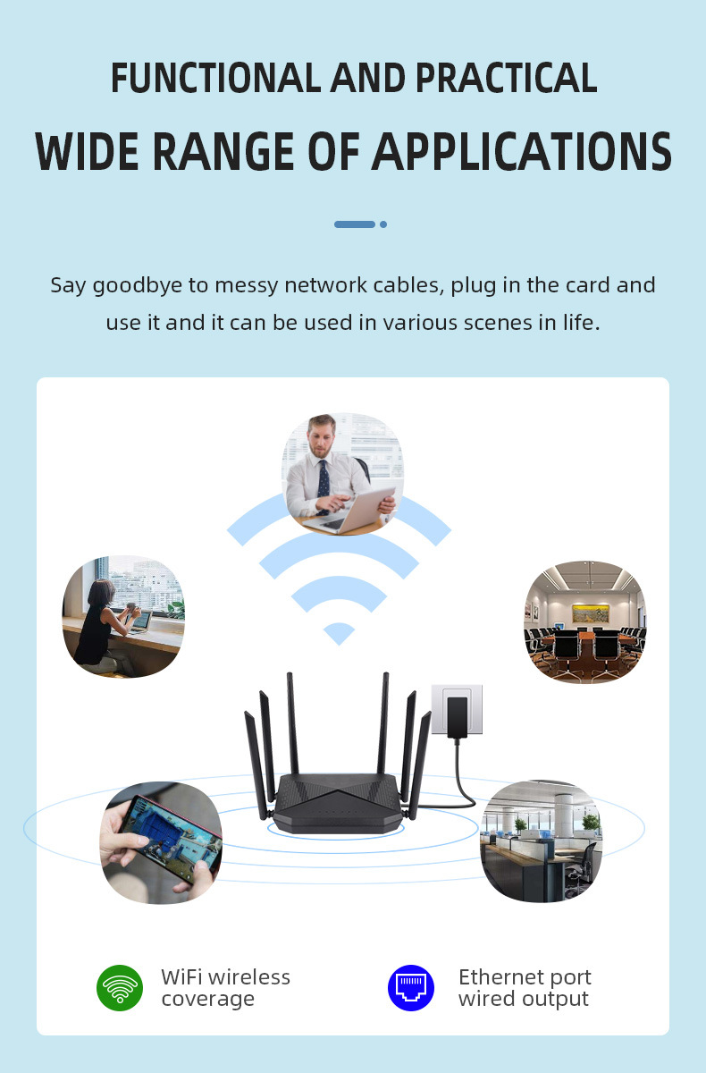 Bộ khuếch đại công suất cao và 2 ăng ten có thể tháo rời bên ngoài với độ lợi cao 9dBi cung cấp phạm vi phát sóng không dây tốt hơn. Tăng cường tín hiệu