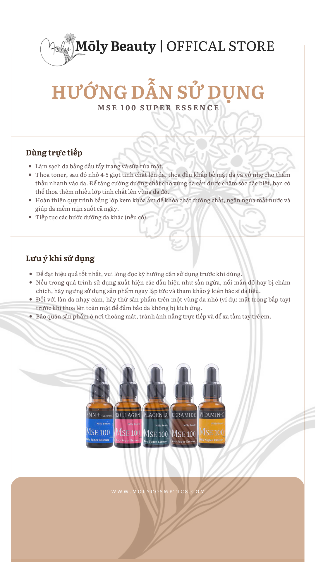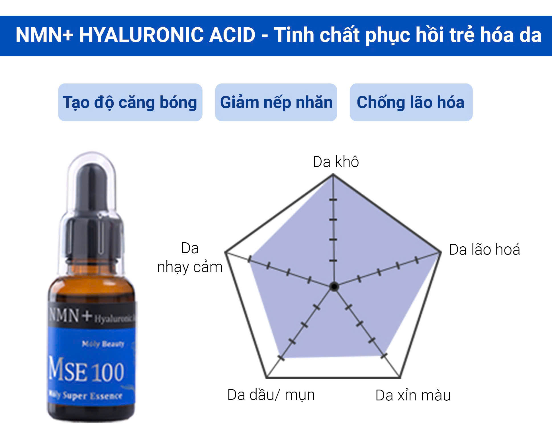 MÔ TẢ: MSE100 Super Essence HY - Tinh chất phục hồi trẻ hóa da NMN+HY 30ml - Mōly Beauty Thương hiệu: Mōly Beauty Quy cách: 30ml Xuất xứ: Nhật Bản Thời hạn sử dụng: 3