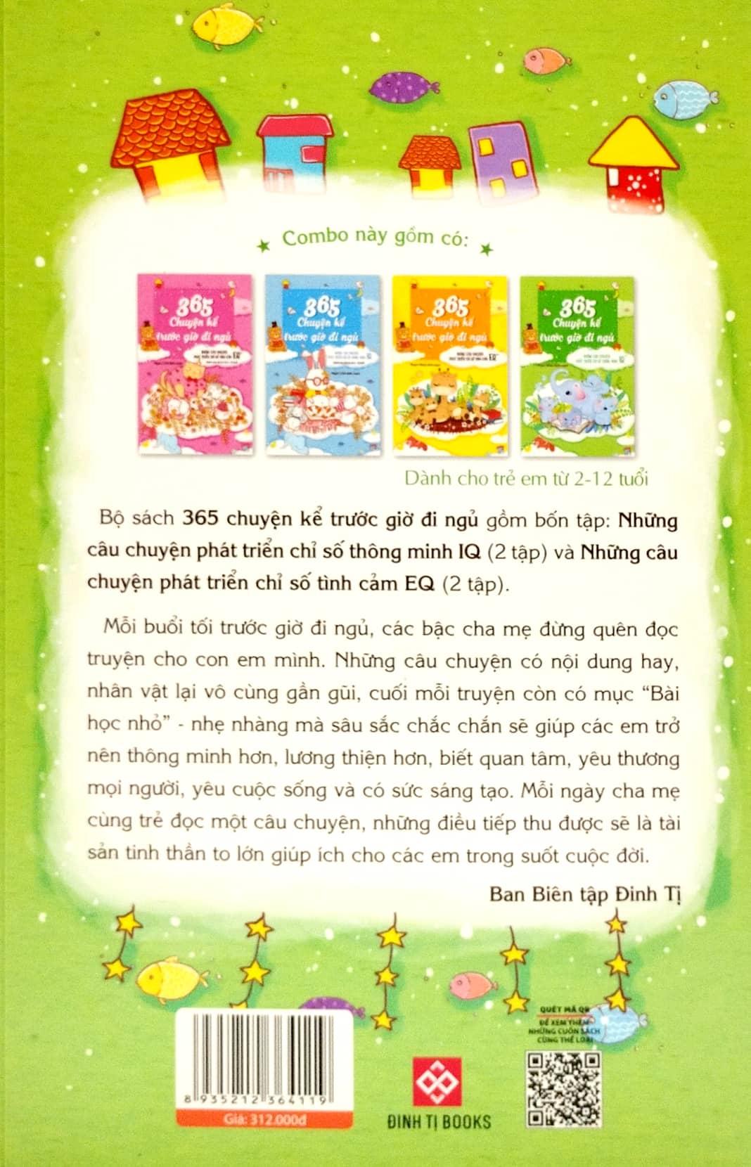 Bộ sách 365 chuyện kể trước giờ đi ngủ gồm bốn tập: Những câu chuyện phát triển chỉ số thông minh IQ (2 tập) và Những câu chuyện phát triển chỉ số tình cảm EQ (2 tập).