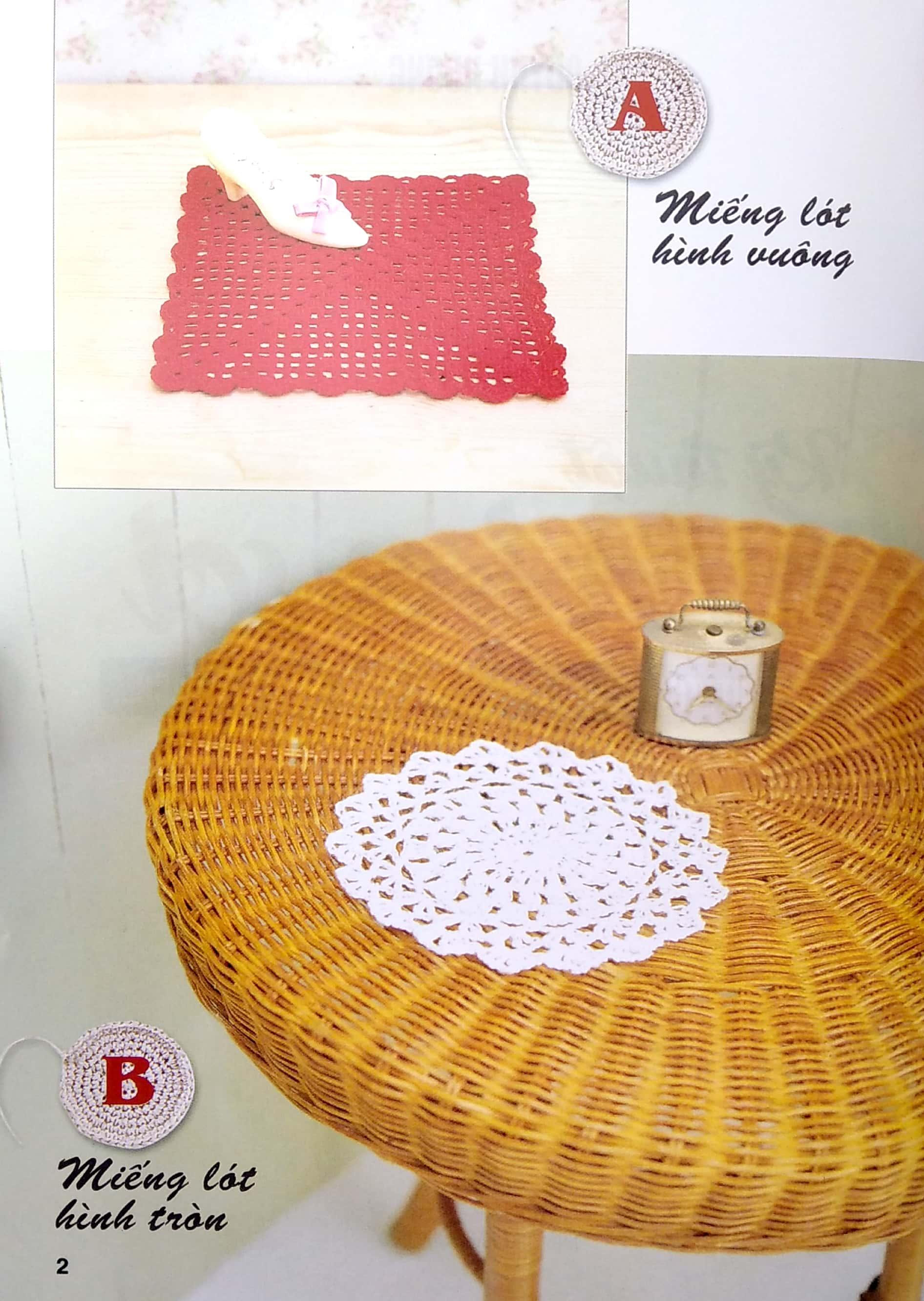 Kỹ thuật móc len sợi tấm lót, thảm, hoa trang trí, giày, nón, giỏ xách.