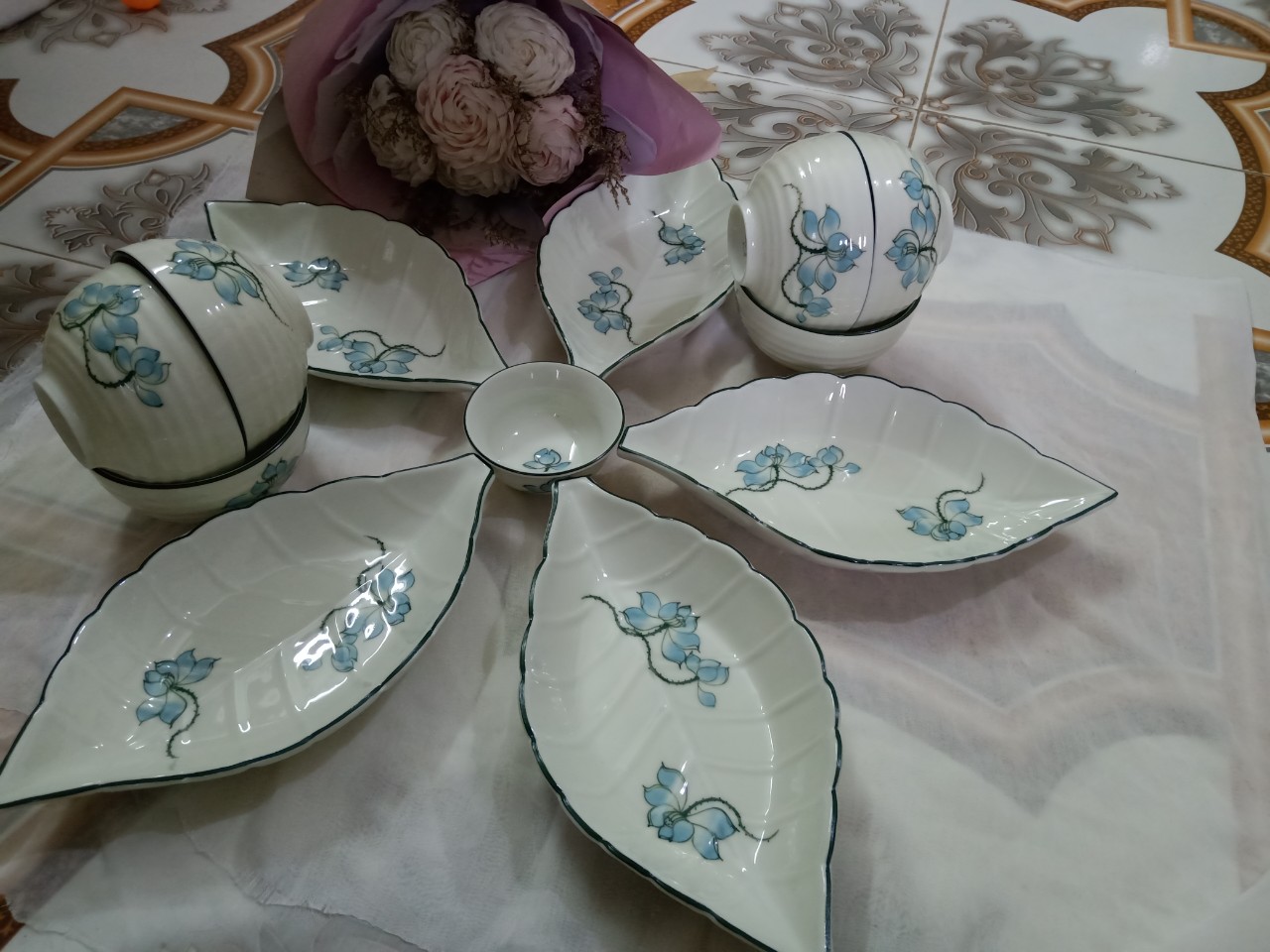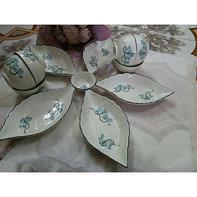 BỘ BÁT ĐĨA HOA MẶT TRỜI SEN XANH 18 CHI TIẾT - TRỌN BỘ gồm : - 1 Bộ 6 cánh đĩa + bát tô tạo hình bông hoa , đk cả bộ 45cm rất