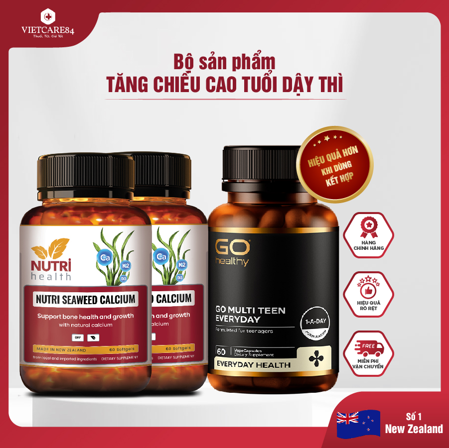 Mua tại TiktokBỘ SẢN PHẨM GIÚP TRẺ TĂNG CHIỀU CAO TUỔI DẬY THÌ GỒM: +2 hộp Viên uống Canxi hữu cơ New Zealand Nutri Seaweed Calcium 60 Viên - dùng 2 tháng +1 hộp viên đa vitamin GO Multi Teen Every Day (60 viên) - dùng 2 tháng KHUYÊN DÙNG: MUỐN TĂNG CHIỀU CAO TUỔI DẬY THÌ CHO TRẺ NÊN BỔ SUNG BỘ SẢN PHẨM TĂNG CHIỀU CAO 1 NĂM 2-3 ĐỢT - MỖI ĐỢT 1-2 THÁNG CHI TIẾT SẢN PHẨM: