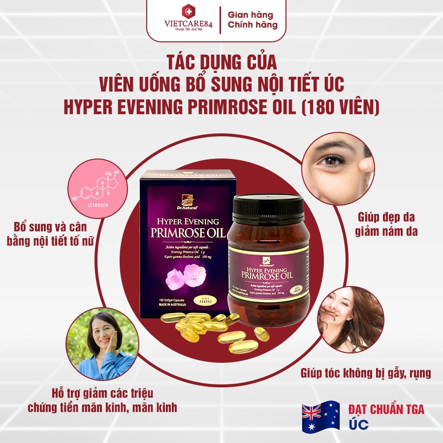 • Giảm quá trình lão hóa và nám da Số ĐKSP của Bộ Y Tế: 11986/2020/ĐKSP (Giấy phép cấp lần 3) Viên uống Dr Natural Hyper Evening Primrose Oil sử dụng công nghệ ép lạnh tiên tiến Viên uống bổ sung nội tiết Hyper Evening Primrose Oil là sản phẩm của tập đoàn Astragrace Úc. Lưu ý: Thực phẩm này không phải là thuốc và không có tác dụng thay thế thuốc. Không dùng cho phụ nữ có thai và rong kinh. Dừng uống nếu mẫn cảm với một trong các thành phần của sản phẩm LIỀU DÙNG : uống 2-3 viên /ngày. Uống tốt nhất sau khi ăn  QUY CÁCH:  180 viên Đối tượng sử dụng: Phụ nữ gặp phải triệu chứng tiền mãn kinh và mãn kinh Phụ nữ muốn hỗ trợ đẹp da.  LÝ DO 1: Viên uống Bổ Sung Nội Tiết Hyper Evening Primrose Oil nhập khẩu chính hãng. Bạn dễ dàng tìm thấy số công bố lưu hành của sản phẩm tại Australia và tại Việt Nam trên hộp thuốc LÝ DO 2: Hiệu quả thực sự đến từ phản hồi của chị em. Chúng tôi xây dựng cộng đồng chị em sử dụng sản phẩm trong suốt gần 4 năm qua ở đây. Hơn 200,000 lượt chị em đọc nội dung & trao đổi hàng ngày trên Nhóm riêng tại fanpage của Nhà thuốc. Mời bạn click vào ảnh dưới đây để cùng tham gia để nhận tư vấn riêng.  LÝ DO 3: Hyper Evening Primrose Oil đạt các tiêu chuẩn khắt khe nhất của Cục Quản Lý Thuốc Trị Liệu của Úc (TGA) với dây chuyền sản xuất chuẩn GMP và hiệu quả của sản phẩm đã được nghiên cứu và kiểm nghiệm khoa học; giúp bạn thực sự yên tâm khi sử dụng Hãy lắng nghe và lựa chọn nhé. Chúng tôi tự hào khi được đồng hành với các chị em trong suốt thời gian qua. Lựa chọn đúng giúp bạn duy trì sức khỏe, sinh lý và sắc đẹp theo thời gian.  BỔ SUNG GLA TỪ THIÊN NHIÊN  GLA tự nhiên có nhiều nhất trong Dầu hoa Anh thảo (EPO) với tỉ lệ 9%, một tỉ lệ hiếm có trong các thảo dược tự nhiên. Bởi vậy dầu hoa Anh thảo được xem là nguồn bổ sung GLA phổ biến nhất hiện nay.    II, Viên uống keo ong SUPER PROPOMAX COMPLEX (60 viên) Keo Ong Úc Dr Natural Super Propomax Complex là công thức kết hợp Keo ong, Maca, Trà xanh và Vitamin D giúp phục hồi sức khoẻ, hỗ trợ tăng cường miễn dịch, tăng cường thể lực. THÀNH PHẦN: Mỗi viên nang mềm Keo ong Dr Natural Super Propomax có chứa: