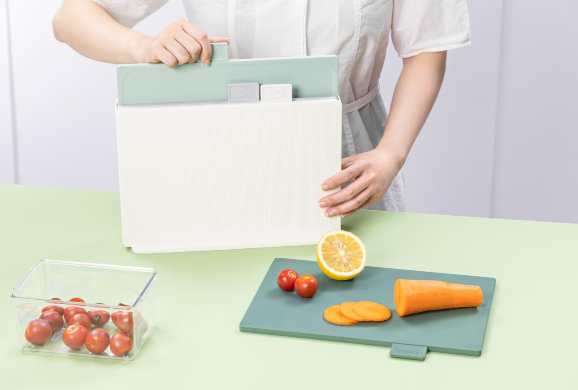 * THÔNG TIN CHI TIẾT SẢN PHẨM - Dòng sản phẩm Folio tiếp tục xu hướng màu xanh lá cây, bốn chiếc thớt có mã màu này đi kèm với một hộp đựng có đường
