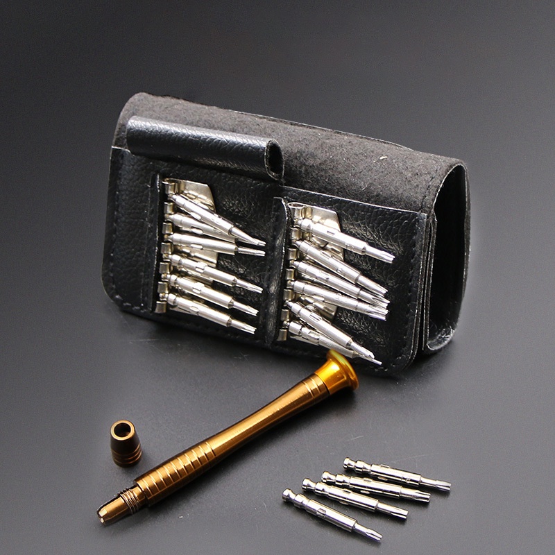 - Đóng gói sản phẩm bao gồm: 24 đầu vít, 1 tua vít và 1 bao da màu đen