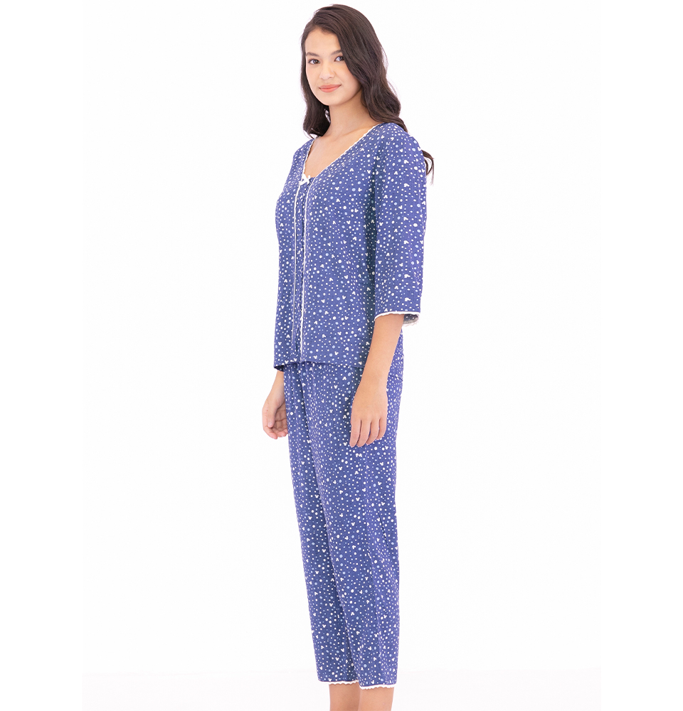 Đặc điểm nổi bật: - Cổ lá sen, tay lỡ - Kẹp ren trắng ở phần lá cổ, lai tay, lai quần - Chất liệu thun - Dáng bộ đồ dài - Thiết kế và