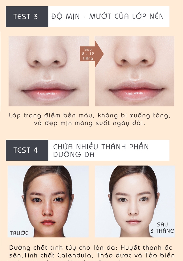 -Khả năng che phủ tốt: Kết cấu mềm mại và bám tối trên da, làm đều màu da mà không cần thêm kem lót, hay che khuyết điểm. -Chống nắng: Khả năng chống tia UV