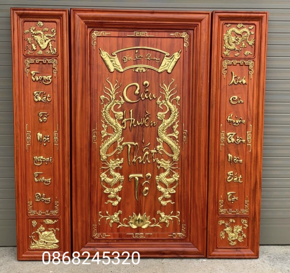 Bộ liễn thờ gia tiên -Cửu Huyền Thất Tổ bằng gỗ hương đá Chất liệu tranh được chế tác bàng gỗ hương ván liền tấm đục nổi mạ vàng sơn PU. Cam kết gỗ lục
