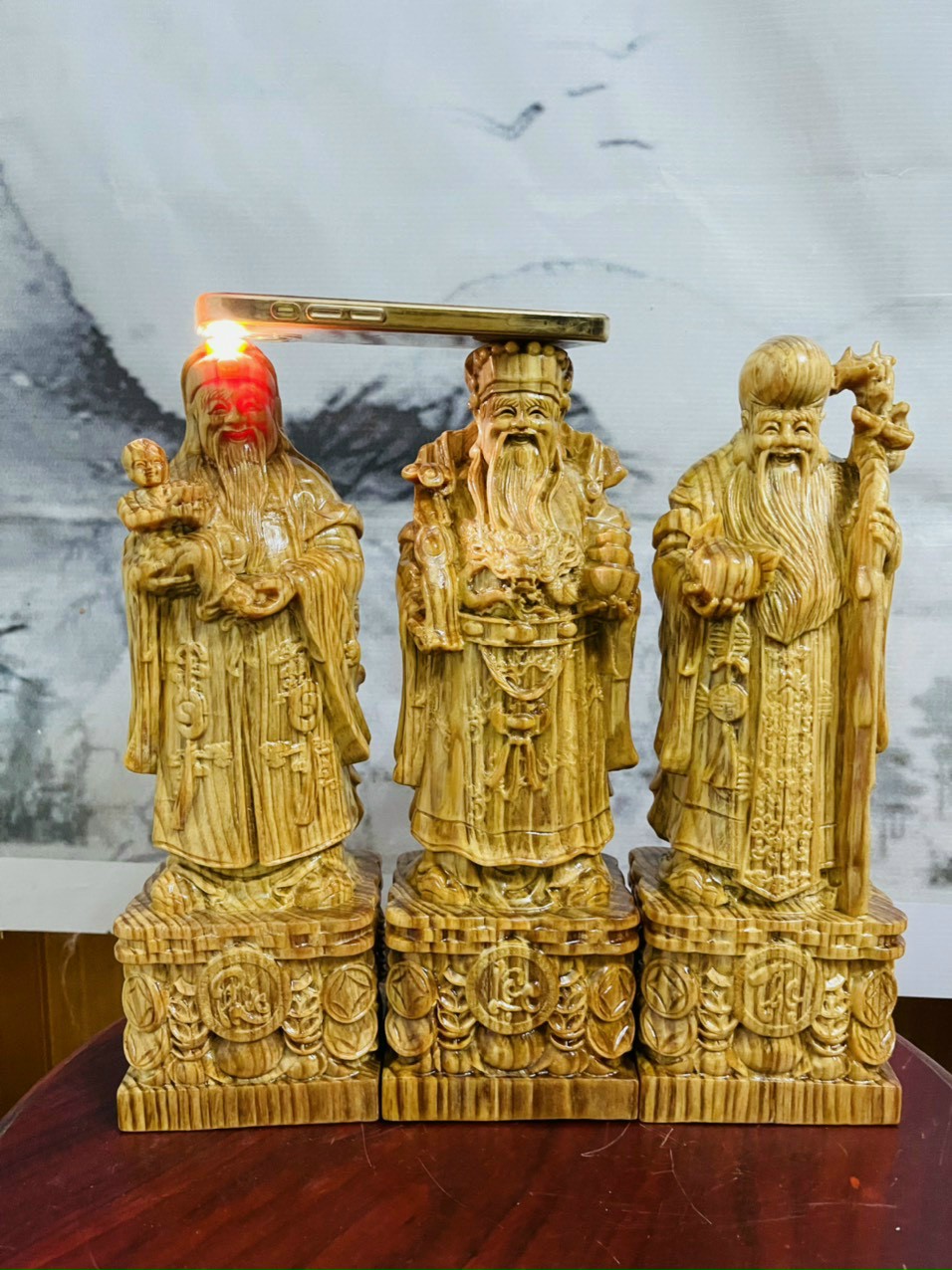 _ Bộ combo bộ tượng phật tam đa phúc lộc thọ liên khối +thêm kệ chân đế được làm bằng chất liệu gỗ huyết long tự nhiên 100% _ Kt cao 30×11×9cm ,kệ chân đế