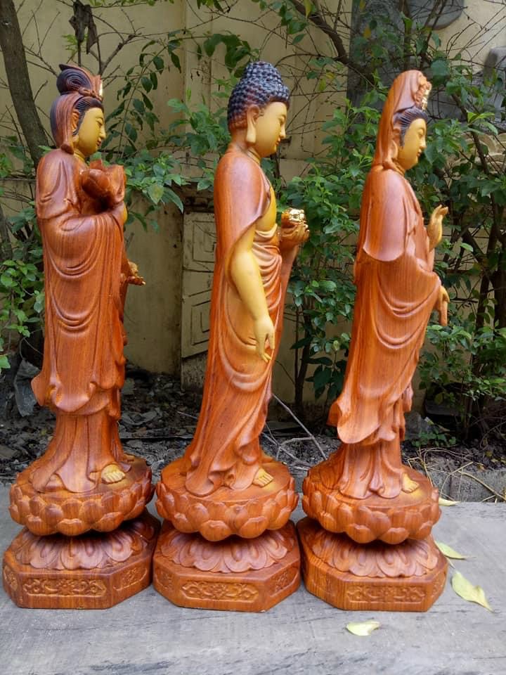 Bộ tượng phật tam thánh được làm bằng chất liệu gỗ hương đá liền khối khối tự nhiên 100%  Kích thước cao 40×12×12cm _ Bộ tượng phật tam thánh được trạm khắc tỉ mỉ ,Tinh sảo kỳ công .Đi hầu hết tất cả mọi chi tiết góc ngách nội dung hoa văn của bộ tam thánh .Đều được ngọt tỉa ,Chỉnh sửa hoàn toàn bằng tay thủ công .Đồng thời tượng được kiểm định kỹ lưỡng như cho vào thẩm sấy cho gỗ khô kiệt .Mục đích trống dập nứt vênh mo mối mọt .Kết hợp với trà nhám ,đánh giấy giáp nhiều nước ,Sờ mát lạnh rồi cho vào phun lót làm bóng mờ để giữ lại mầu sắc vân gỗ tự nhiên ,Bộ tam thánh được làm và hoàn thiện do bàn tay khối óc tài hoa ,Từ những người thợ giàu kinh nghiệm ,Cũng như tay nghề cao trong làng nghề truyền thống .Chính vì thế bộ tượng phật tam thánh đã đáp ứng đầy đủ những tiêu trí ( Đẹp bền rẻ ) Thẩm mỹ nghệ thuật với chất lượng tuyệt vời