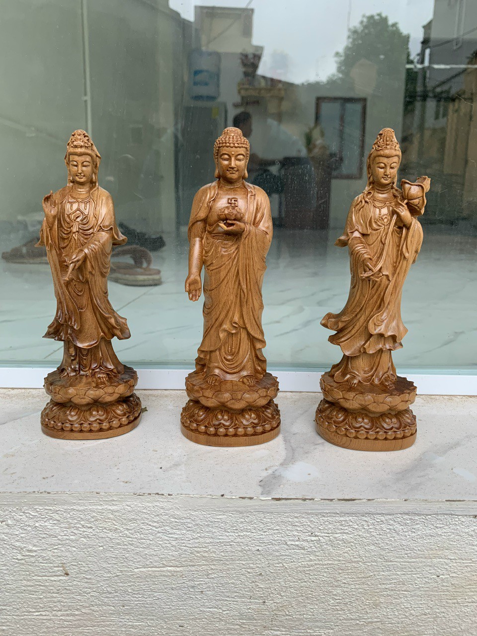 Bộ tượng phật Tây Phương Tam Thánh gỗ bách xanh cao 15cm và 20cm