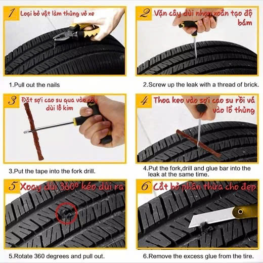 Bộ Dụng Cụ Vá Lốp Xe Không Săm Khẩn Cấp Cho Ô Tô, Xe Máy – Vá Lụi, Vá Rút Nhanh Gọn Tại Nhà Hoặc Dọc Đường