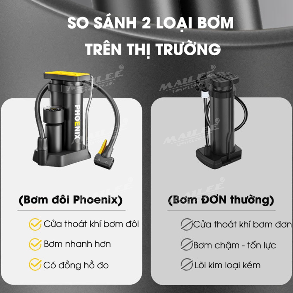 - Bơm đạp chân nhẹ, độ hồi cao, ống đôi lõi nhôm, đảm bảo áp suất khí đi nhanh và mạnh