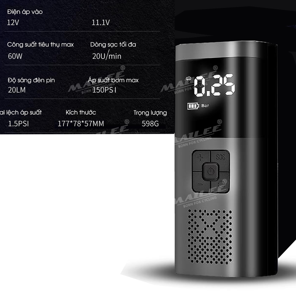 GIỚI THIỆU SẢN PHẨM Chuỗi máy bơm Michelin mới sử dụng kiểu mới QRV (Quick Release Valve: Van Xả Nhanh) với thiết kế độc nhất và công nghệ tiên phong. Chúng tôi luôn cam kết tập trung vào nghiên cứu và phát triển công nghệ, cải tiến sản phẩm và mang đến trải nghiệm tốt cho người tiêu dùng cũng như hỗ trợ khẩn cấp an toàn cho người tiêu dùng trên thế giới. Sản phẩm này thích hợp để bơm lốp xe hơi, xe đạp, xe máy và các vật dụng áp suất thấp như banh thể thao và các đồ chơi bơm hơi nhỏ. Đèn pha với thiết kế độc nhất giúp bạn lái xe ra khỏi chỗ tối và làm việc bình thường ở những nơi thiếu ánh sáng. VUI LÒNG ĐỌC KỸ HƯỚNG DẪN SỬ DỤNG TRƯỚC KHI SỬ DỤNG MÁY BƠM VÀ CHÚ Ý CÁC NHẮC NHỞ VÀ CẢNH BÁO. 1. Vui lòng đọc hướng dẫn sử dụng. Sử dụng không đúng cách có thể gây thương tích và làm hư hỏng máy. 2. Áp suất lốp đúng rất quan trọng để đảm bảo an toàn cho bạn và an toàn giao thông. 3. Lốp quá căng hay quá mềm có thể gây nguy hiểm. Luôn kiểm tra áp suất lốp xe định kỳ hàng tuần theo áp suất do nhà sản xuất xe khuyến nghị, 4. Luôn kiểm tra áp suất lốp ở điều kiện nhiệt độ bình thường. Không kiểm tra áp suất lốp ngày sau hành trình dài. Bạn nên để lốp xe nguội đi trong ít nhất 30 phút trước khi đo áp suất lốp. 5. Luôn sử dụng máy bơm ở nơi an toàn, tránh xa đường giao thông và các nơi nguy hiểm khác. 6. Kiểm tra máy bơm trước khi sử dụng, phạm vi áp suất máy bơm từ 0-145 psi. 7. Không được vận hành máy bơm liên tục quá 10 phút. Sau mỗi 10 phút vận hành, hãy để máy bơm nguội đi trong vòng 10 phút. 8. Ống mềm bơm lốp sẽ bị nóng lên khi bơm lốp. Khi sử dụng thì không đụng vào để tránh bị bỏng. Máy bơm này được trang bị cách nhiệt và gia tăng bảo vệ cho các bộ phận của ống mềm bơm lốp có nhiệt độ cao, hãy chú ý sử dụng. 9. Không được gấp hoặc làm tắc ống mềm bơm lốp trong khi vận hành máy bơm. 10. Không sử dụng máy bơm khi máy bơm bị biến dạng, hư hỏng, nóng chảy, cháy, ngâm trong nước hoặc khi có bất kỳ bộ phận nào bị hư. 11. Không sử dụng máy bơm nếu có âm thanh bất thường hoặc nhiệt độ tăng cao trong khi vận hành máy bơm. 12. Không cho trẻ em sử dụng máy bơm. Phải giám sát trẻ em để đảm bảo rằng trẻ em không nghịch máy bơm. 13. Trẻ em không được sử dụng các linh kiện để tránh thương tích. 14. Không có linh kiện để người sử dụng tự thay thế - KHÔNG ĐƯỢC MỞ. Nếu không tuân thủ thì có thể vô hiệu bảo hành, ngoại trừ việc thay pin. 15. Luôn chú ý máy bơm trong khi sử dụng. 16.Không sử dụng máy bơm trong khi đang sạc. THÔNG TIN KỸ THUẬT Thương hiệu: Michelin/ Michelin Mô hình: M2208S PIN: 10.8 V DC/ 2500 m Ah Công suất: 80W Phạm vi áp suất : 0-- 145psi Đơn vị đo áp suất: psi / bar / kpa Chiều dài ống bơm 20cm ĐÈN COB 3W Thông số xi lanh: xi lanh đơn Đối tượng áp dụng: lốp xe đạp, lốp ô tô thông thường, bóng, xe điệ