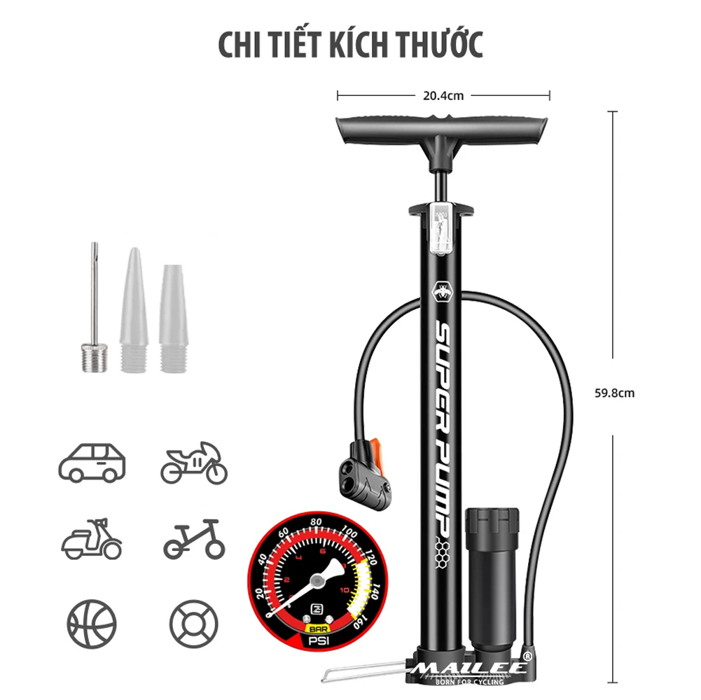 Thông tin sản phẩm: - Sản phẩm ống bơm gồm:. + Đồng hồ đo áp suất, van bơm có đầu gài tiện lợi cho xe máy và.xe đạp,. + Thiết kế thông minh lực bơm