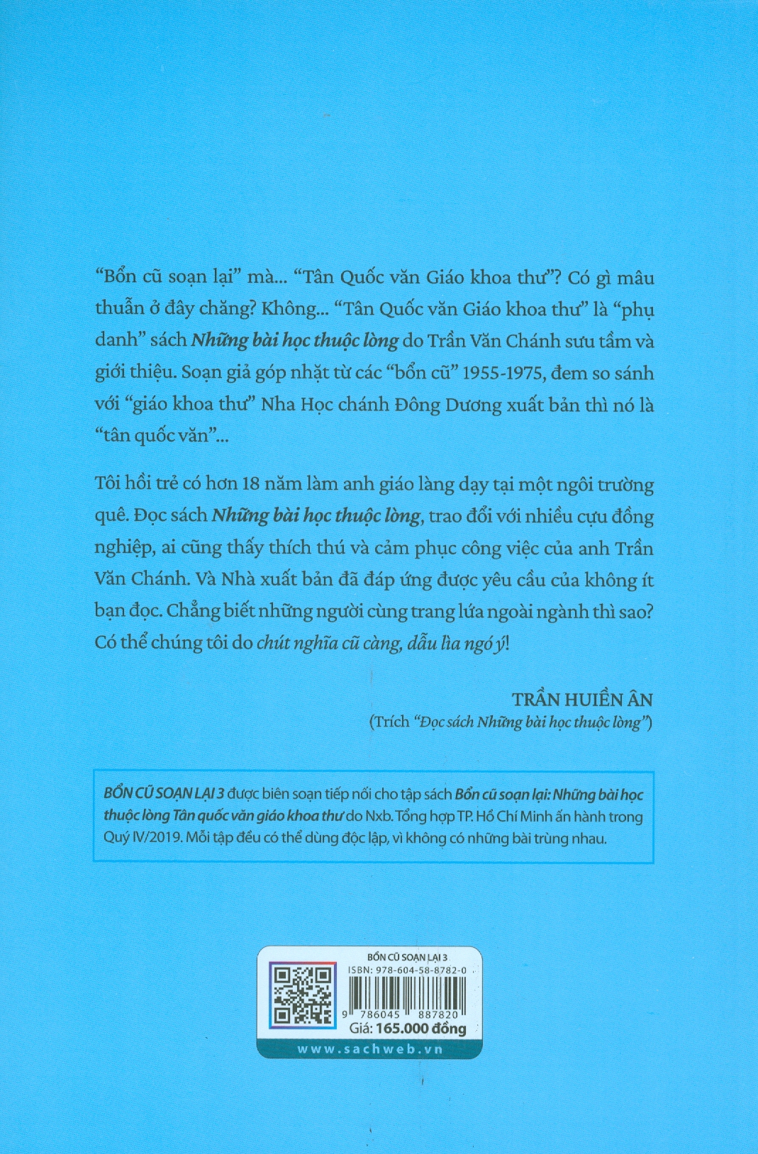 Cuốn sách bạn đang cầm trên tay thuộc bộ sách 3 cuốn, với cuốn đầu tiên là Bổn cũ soạn lại Những bài học thuộc lòng Tân quốc văn giáo khoa thư do NXB Tổng Hợp Thành phố Hồ Chí Minh ấn hành trong Quý IV năm 2019, với 263 bài học thuộc lòng các lớp Ba, Nhì (lớp Bốn bây giờ), Nhất (lớp Năm bây giờ) của bậc tiểu học giai đoạn trước năm 1975.