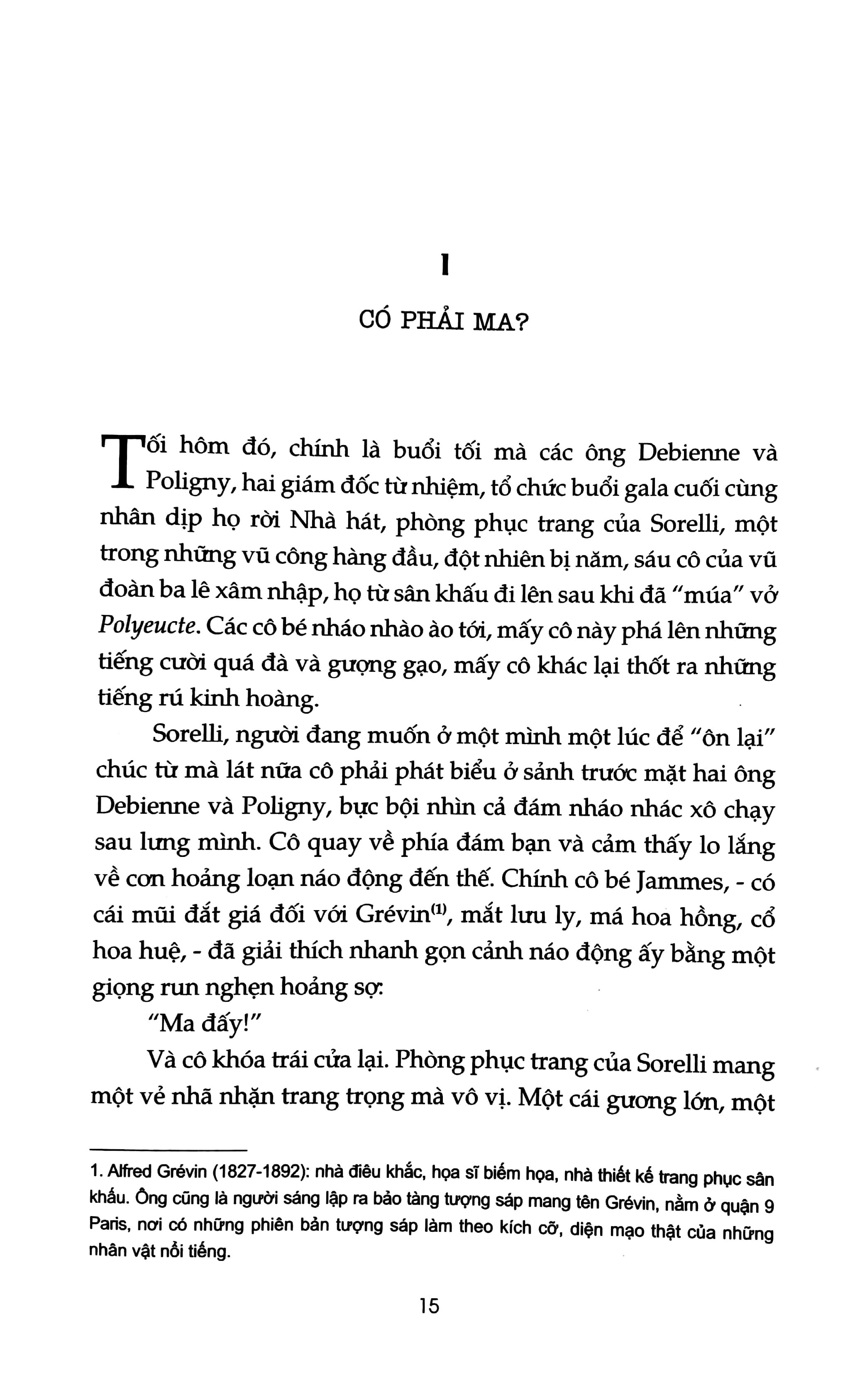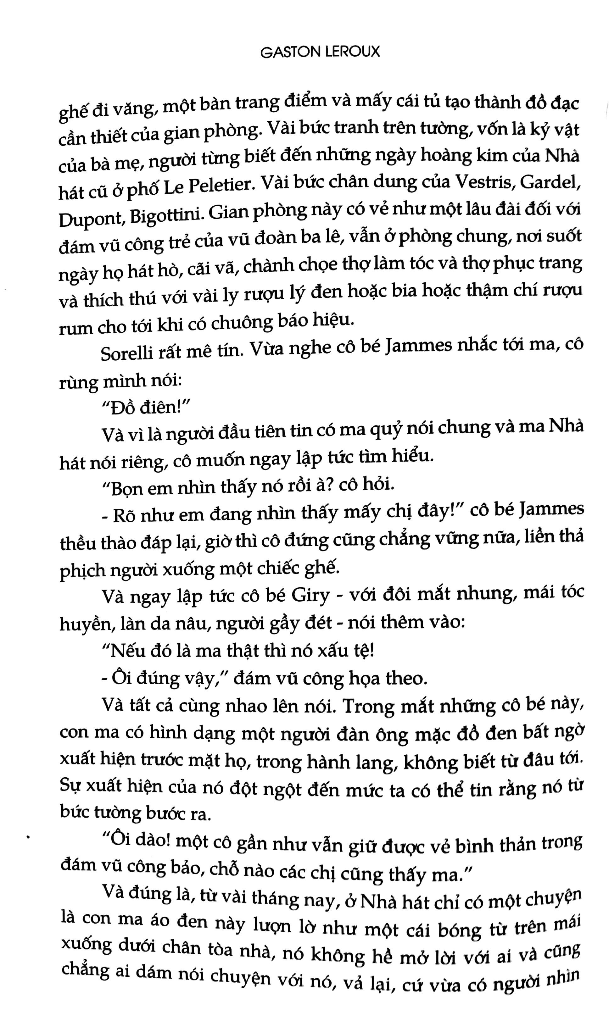 “Con ma Nhà hát đã tồn tại. Nó hoàn toàn không phải, như từ lâu người ta vẫn tin, một cảm hứng nghệ sĩ, thói mê tín của các đời giám đốc, trò sáng tạo vô vị từ những bộ óc quá khích của đám con gái trong vũ đoàn ba lê, của mẹ chúng, của các chị xếp chỗ, của những người làm trong phòng gửi đồ và của bà gác cổng.”