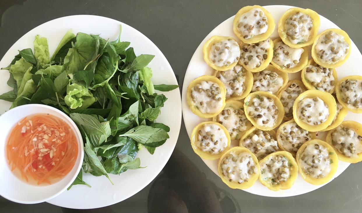 Bước 2 : Đun nóng chảo, cho 1 muỗng dầu ăn, thịt ba rọi heo, tôm hoặc tép, thịt gà, thịt vịt bầm nhuyễn hành tây vào chảo xào sơ. Múc 1 vá bột đã khuấy tráng mỏng và xoay tròn đều, cho giá, hẹ (củ hủ dừa), đậu xanh cà đã luộc chín, vào giữa bánh. Đậy nắp lại khoảng 1 phút cho bột chín. Thấy bánh bung lên, vàng và giòn thì lấy xẻng gập đôi bánh lại, xúc ra dĩa