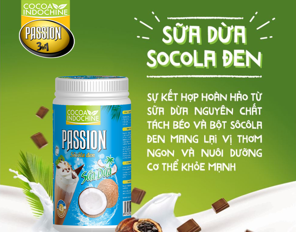 - Bột Cacao Hòa Tan Passion 3 In 1 Cocoa Indochine có mùi vị thơm ngon, giàu dinh dưỡng với sự kết hợp độc đáo giữa hương Sôcôla đen thơm nồng và hương vị Cappuccino đầy