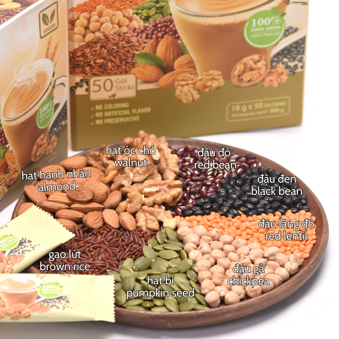 Bột ngũ cốc Tami có thành phần 100% thiên nhiên là các loại hạt đã được ngâm nảy mầm (gạo lứt, đậu đỏ, đậu gà); đậu lăng, yến mạch, óc chó, hạnh nhân, hạt bí,... Việc ngâm nảy mầm các loại hạt giúp loại bỏ các chất không tốt và phát huy tối đa các chất dinh dưỡng sẵn có trong hạt. Đồng thời sản phẩm hoàn toàn không có phẩm màu, không hương liệu, không chất bảo quản. Nhiều loại hạt có độ dinh dưỡng cao được kết hợp trong cùng một sản phẩm giúp bổ sung các vi chất thiết yếu.