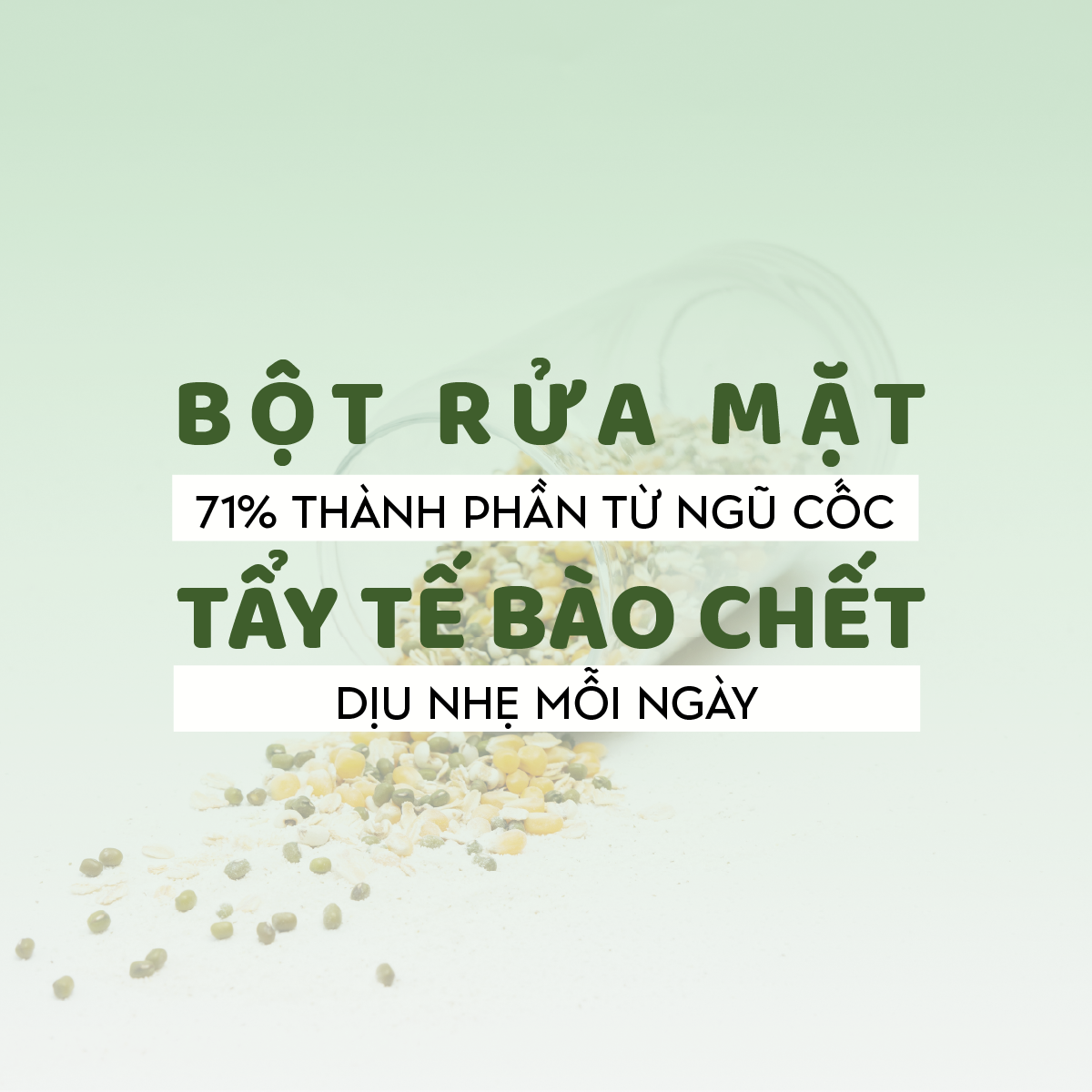 ● Ngũ cốc chiết xuất từ thiên nhiên (lúa mạch, ngô, mầm lúa mì, yến mạch, cám gạo, ý dĩ, đậu xanh): làm sạch, loại bỏ tế bào ch ết dạng vật lý, làm mềm mịn, dưỡng ẩm, dưỡng sáng da
