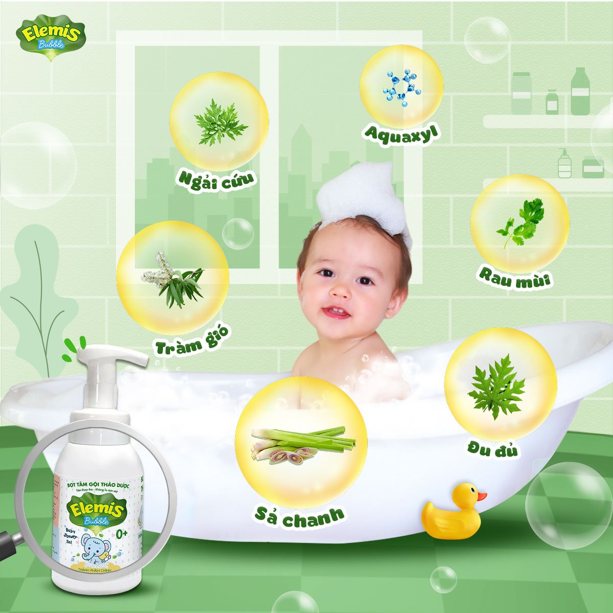 Bọt tắm gội thảo dược Elemis Bubble với các chiết thảo dược thiên nhiên từ Đu đủ, Ngải cứu, tinh dầu Màng tang, tinh dầu Mùi, tinh dầu Tràm gió, tinh dầu Sả chanh. Bọt tắm gội thảo dược Elemis Bubble có tác dụng làm sạch, dưỡng ẩm và bảo vệ bé trước các vấn đề về da thường gặp như rôm sảy, hăm tả, mẩn ngứa, mụn nhọt…