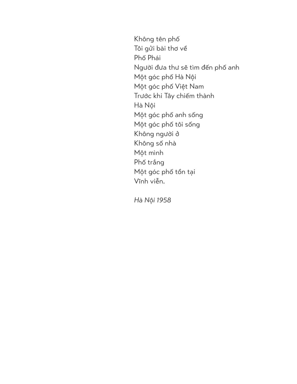 “Không người ở Không số nhà Không tên phố Tôi gửi bài thơ về Phố Phái Người đưa thư sẽ tìm đến phố anh Một góc phố Hà Nội Một góc phố Việt Nam…” Văn Cao