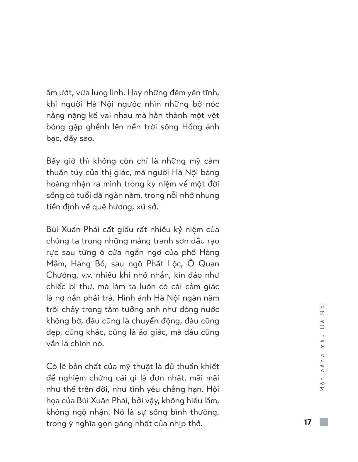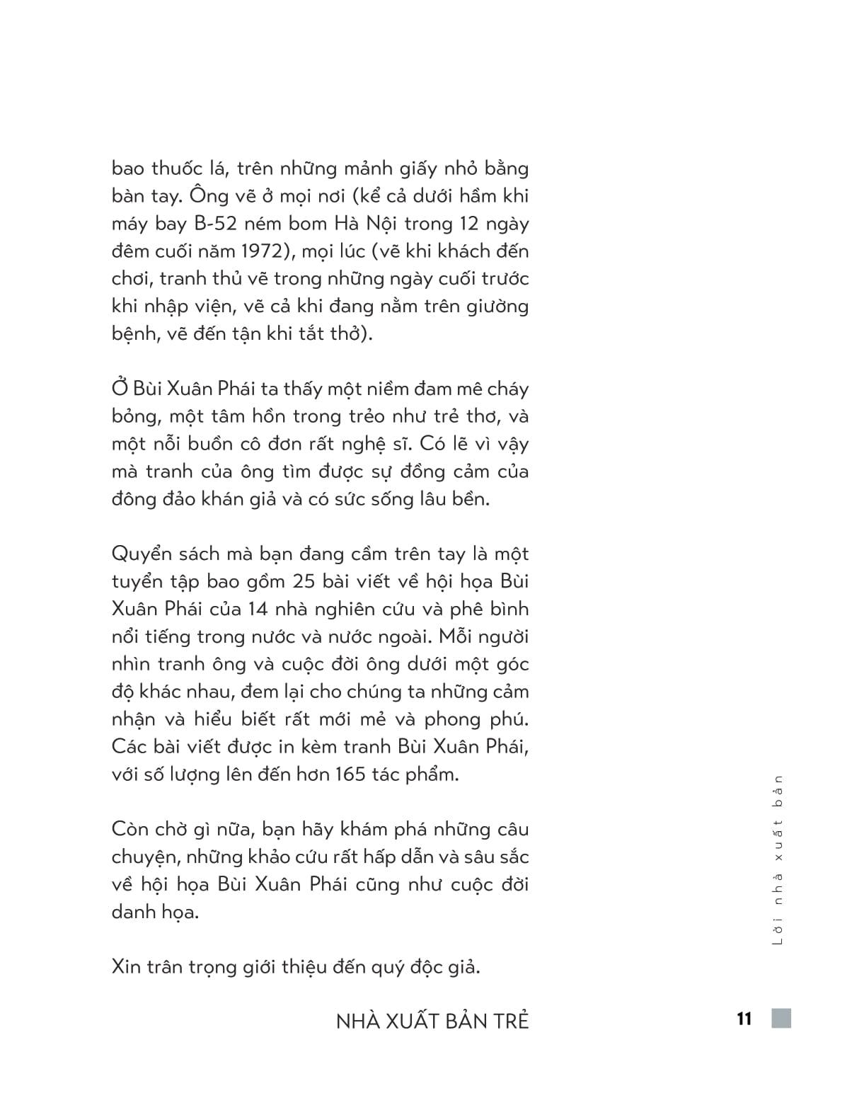 Quyển sách mà bạn đang cầm trên tay là một tuyển tập bao gồm 25 bài viết về hội họa Bùi Xuân Phái của 14 nhà nghiên cứu và phê bình, nhà sưu tập tranh, văn nghệ sĩ nổi tiếng trong nước và nước ngoài. Mỗi người nhìn tranh ông và cuộc đời ông dưới một góc độ khác nhau, đem lại cho chúng ta những cảm nhận và hiểu biết rất mới mẻ và phong phú. Các bài viết được in kèm tranh Bùi Xuân Phái, với số lượng lên đến hơn 165 tác phẩm. Còn chờ gì nữa, bạn hãy khám phá những câu chuyện, những khảo cứu rất hấp dẫn và sâu sắc về hội họa Bùi Xuân Phái cũng như cuộc đời danh họa.